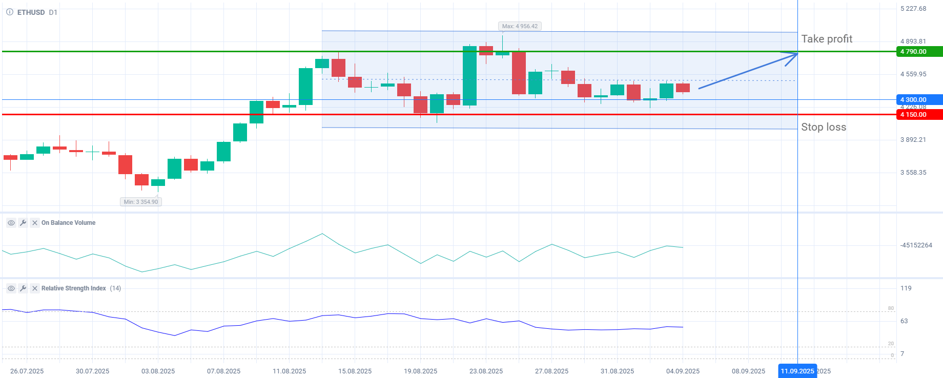 Покупка ETHUSD с целью 4790 на фоне ожидания теста верхней границы канала