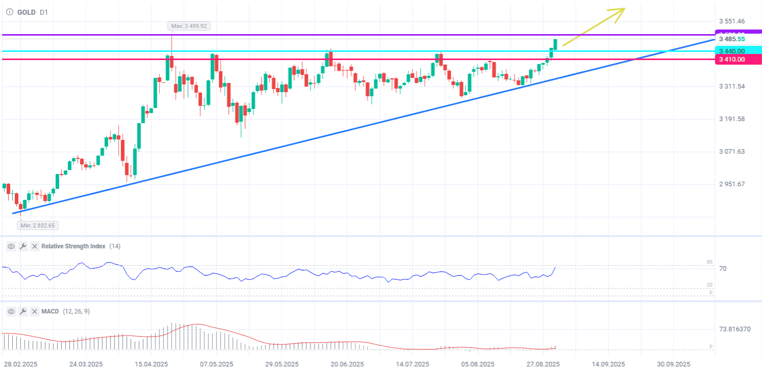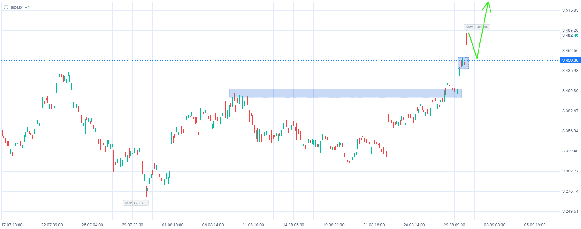 Золото прорывается через сопротивление 3440 к новому максимуму 3500