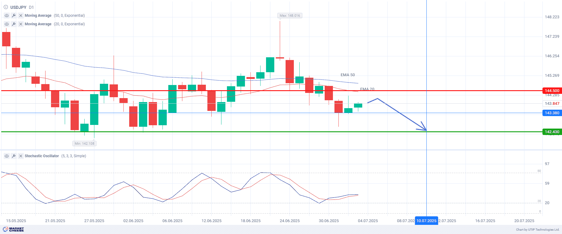 Продажа USDJPY во время отскока с целью 142,430