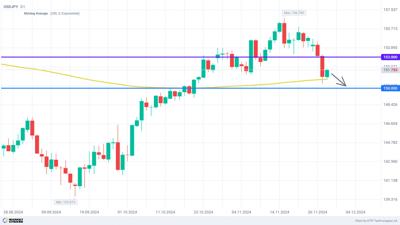 Падение USDJPY способно достичь уровня 150